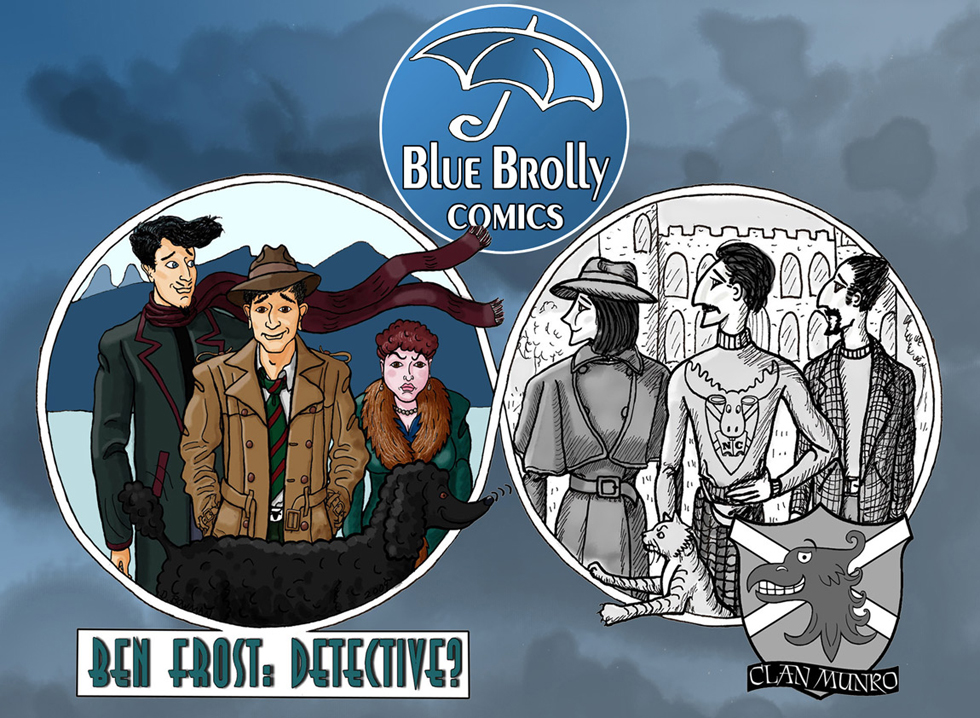 Donna, Laurel and Robyn welcome you to Blue Brolly comics, where you’ll find our full-colour graphic novel — Ben Frost: Detective? And, in beautiful black and white, our comic strip — Clan Munro. ![]()