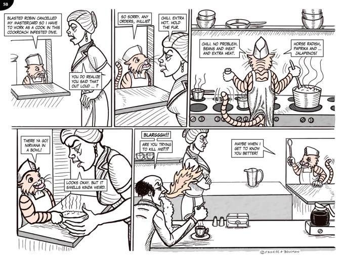 McTavish is back, with a splash of colour! As you recall, he was relentlessly pursued by Roger the Bad Swan, and decided to go On The Lam. And he actually managed to find a job. Which is going about as well as you’d think …