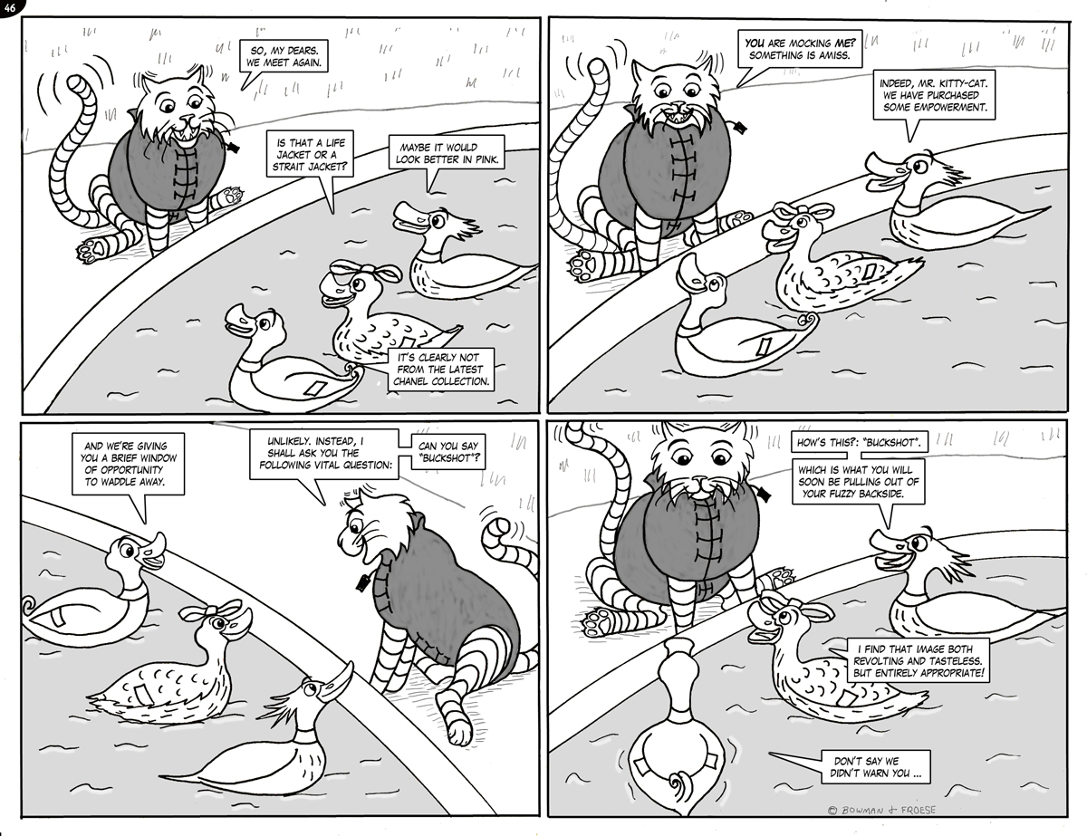 See the first set of Clan strips here. That’s where you’ll find McTavish’s previous encounters with the ducks. And the second (and latest) set are over here.