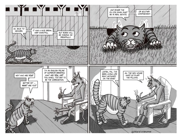 Oh, crap. Well. Yeah. You guessed it. My first “official” meeting with Robin resulted in another short rumble. But we came to terms, since he realized that he had to keep me based on centuries-old Arcane Library Cat Legislation. I even got to move into his townhouse! Win win except for Robin.